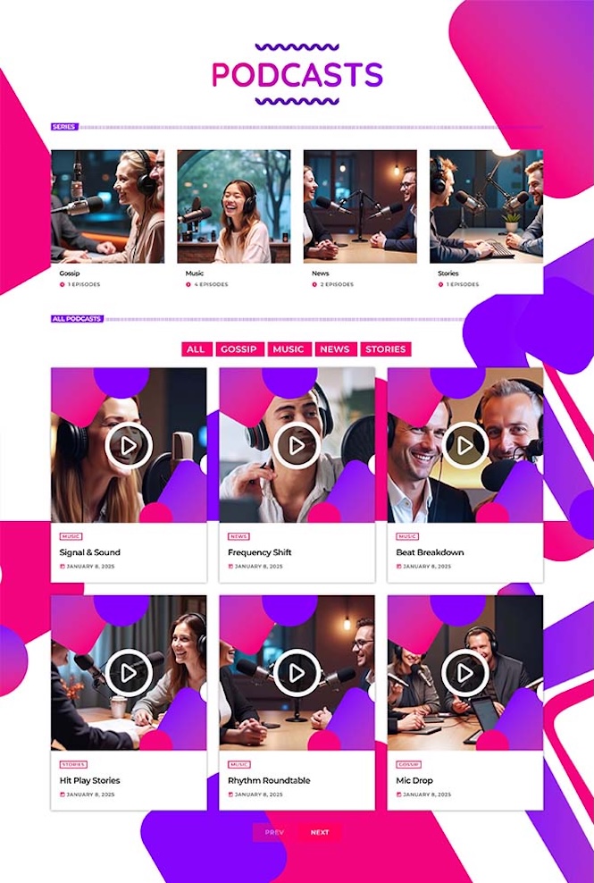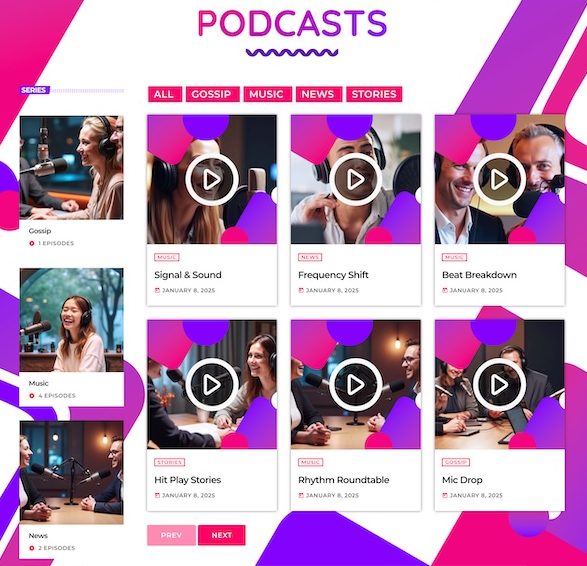 A dedicated podcast section allows you to present your series and episodes with a filterable layout.