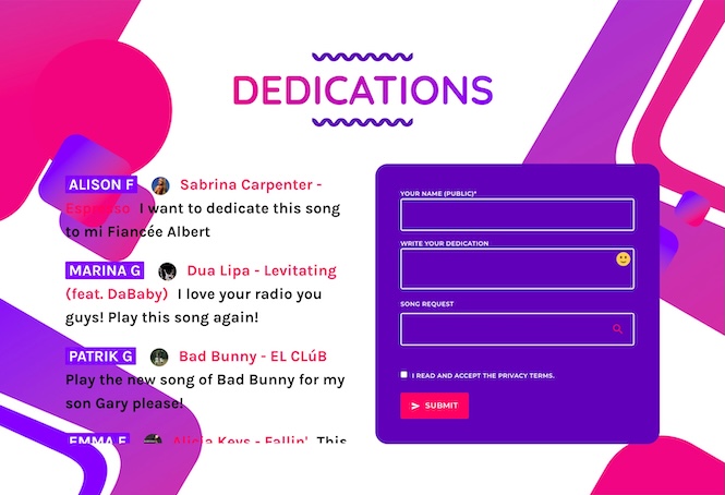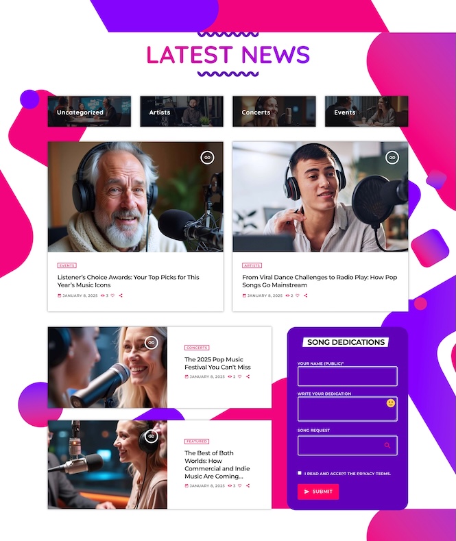 A latest news section with categories keeps your listeners updated, while a dedicated space for song dedications encourages interaction with your fans.