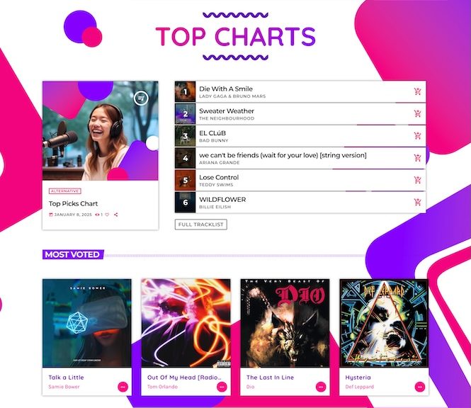For music lovers, there’s a top chart highlight with its tracklist and a ranking of the most voted songs of the week.