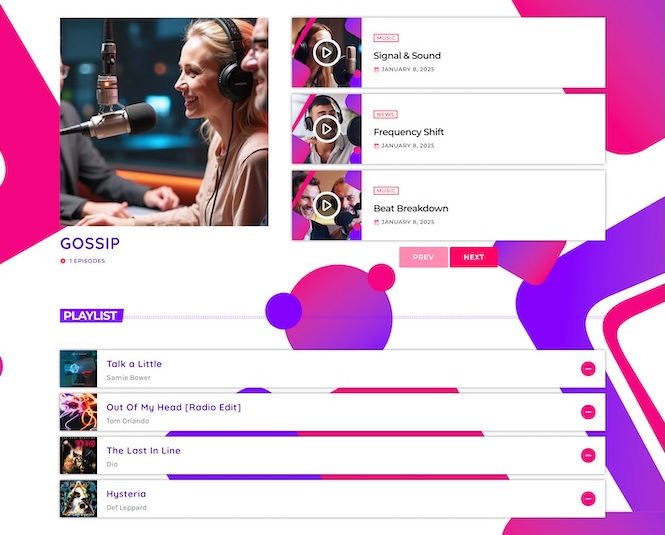If your radio station is all about fun, energy, and a vibrant style, these new radio website templates included with Pro Radio Plus are made for you. Designed with bold colors, playful layouts, and dynamic effects, they help you build a website that feels as lively as your station sounds. Perfect for webradios, podcasting, and broadcasting, these templates are built to keep your audience entertained, engaged, and coming back for more.