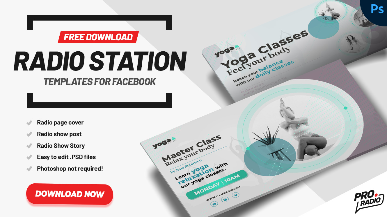 - Facebook and Twitter post: using the Facebook Post yoga radio template, you can make a good looking promotional post for your radio shows, and promote your music and speakers with style.