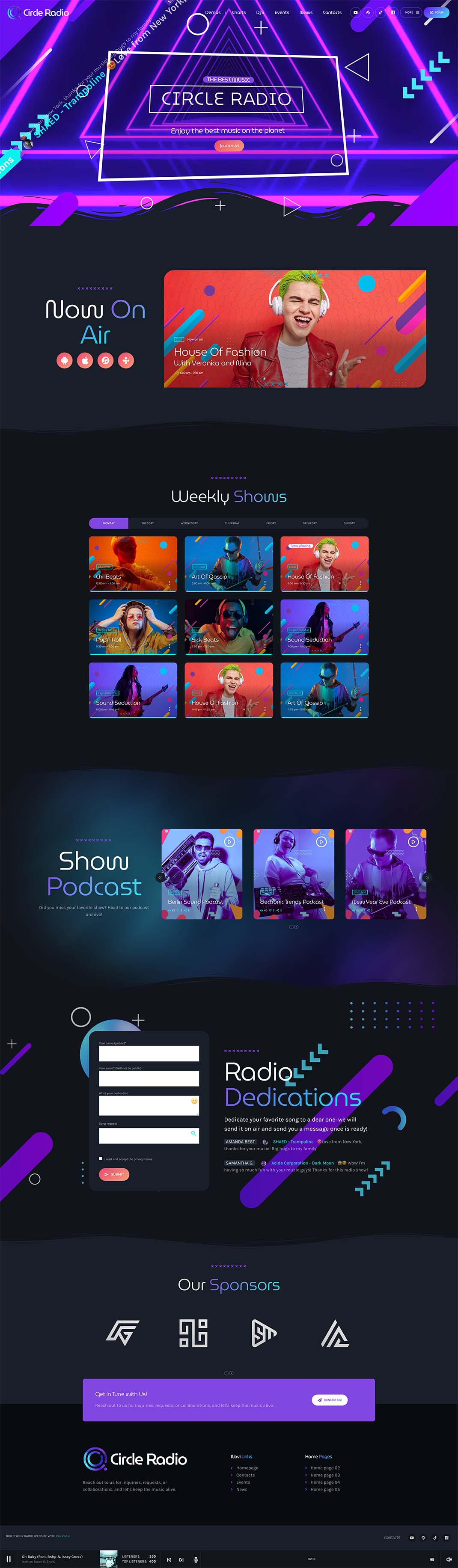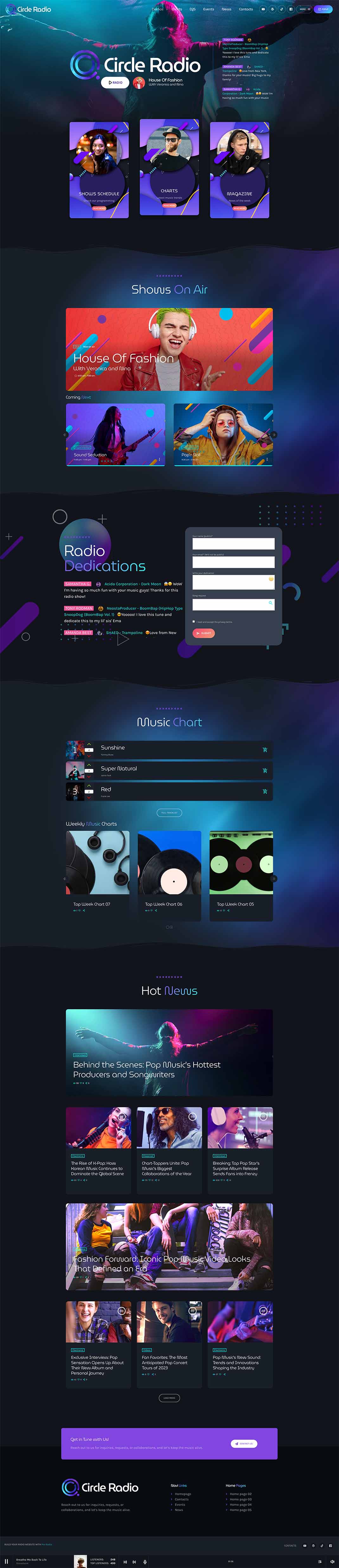 - The first home page features a huge title with gradient captions, a now on air radio show section, a play button, and an upcoming radio shows carousel. It also includes a music chart with playable MP3 tracks, YouTube, or Spotify videos and music, and upcoming charts. Finally, it has a blog news section with a carousel of titles, highlights, and dedications, as well as a dedications form and a scrolling dedication list.