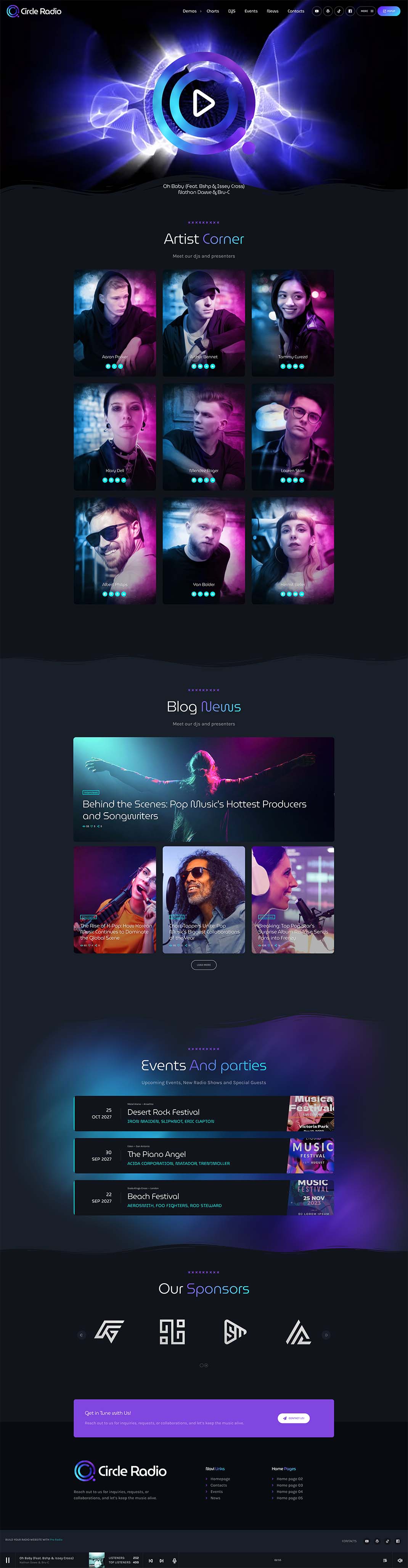 - The third home page has a nice video background, an artist carousel or grid, a blog news section, events, and a sponsor carousel.