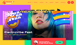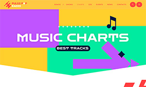 This radio website template has been designed with energetic colours, with an Imperial Red taking the lead as the main colour and complementary colours like Violet, Spring Green, and Sunflower Yellow contributing to a refreshing look. Enhanced by vector shapes, it creates a great dynamic throughout the template. The use of the Zen Dots font adds a modern and striking touch, making it perfect for a pop, funk, or commercial music and news radio website.