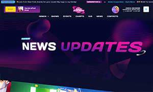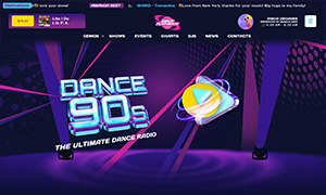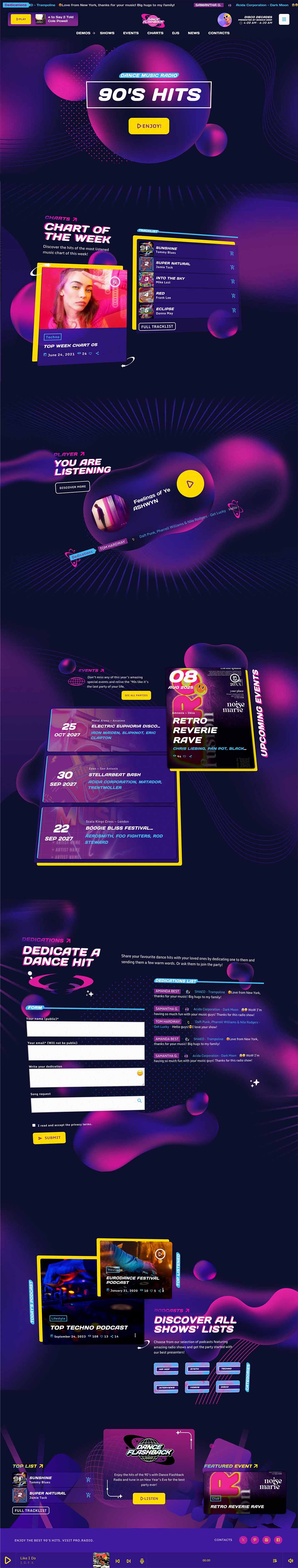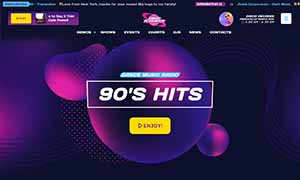 Enjoy the best dance 90’s music hits with this groovy and dynamic radio website demo. Get nostalgic with a combination of vibrant colours and a retro look and feel, but with a modern touch, and enjoy navigating through the different radio website templates available.
