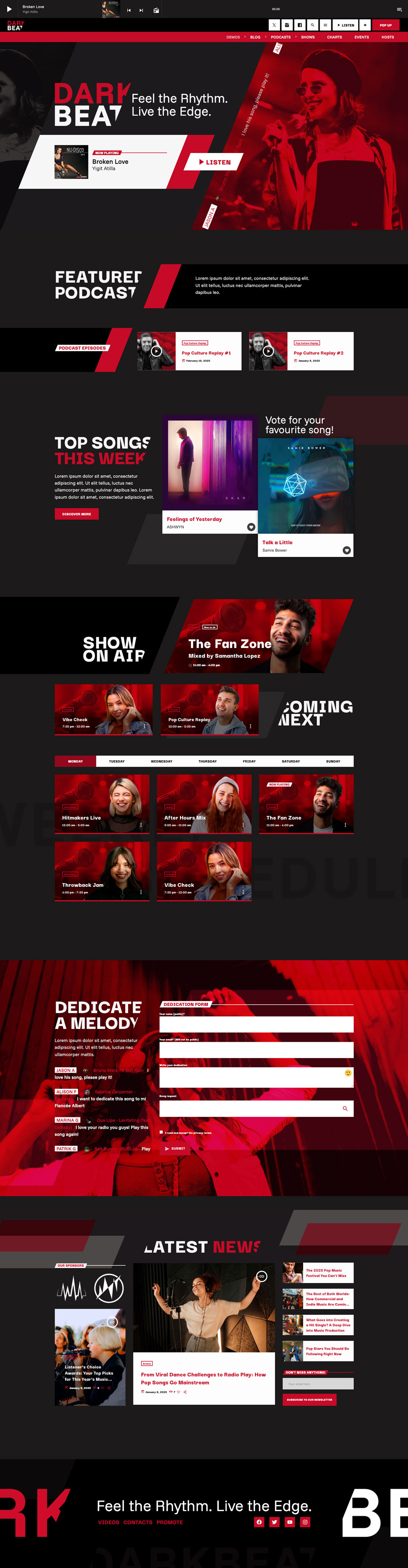Introducing Dark Beat Radio, the latest template in the Pro Radio Website Builder collection, designed for online radio stations, DJs, and producers of electronic, techno, rock and commercial music seeking a powerful and engaging digital presence.