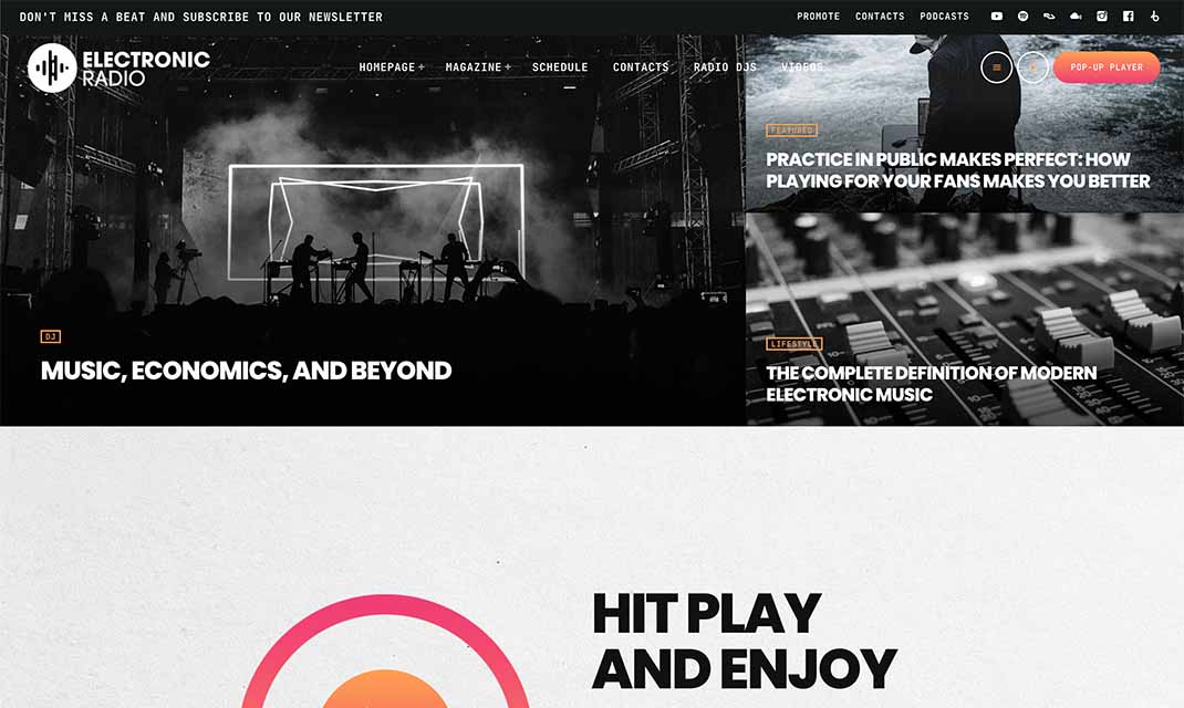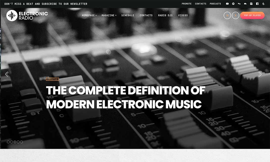 The demo 3 has a unique stylish design dedicated to electronic music radios, with a fresh color combination and lots of pre-built elements that you can modify and reuse for youra radio website. Perfect for Electro, Techno, Drum’n Bass ad more!