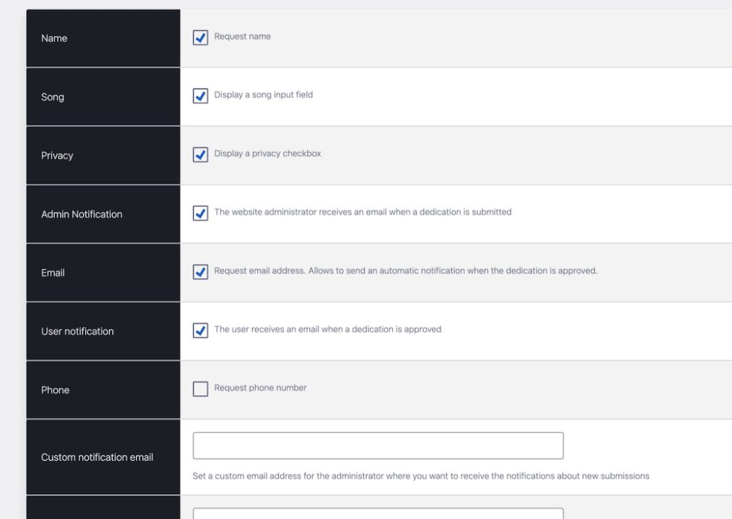 The administrator receives an instant email when a new dedication is submitted. So you know in real time when you get a message, and can promptly reply to the user. This can instantly boost the engagement because allows to provide instant feedback to the users, and makes them happy for a rapid interaction with their favorite radio. Also, this function saves you time, allowsing to check the notifications form your email, without requiring to log in your WordPress dashboard to verify pending dedications.