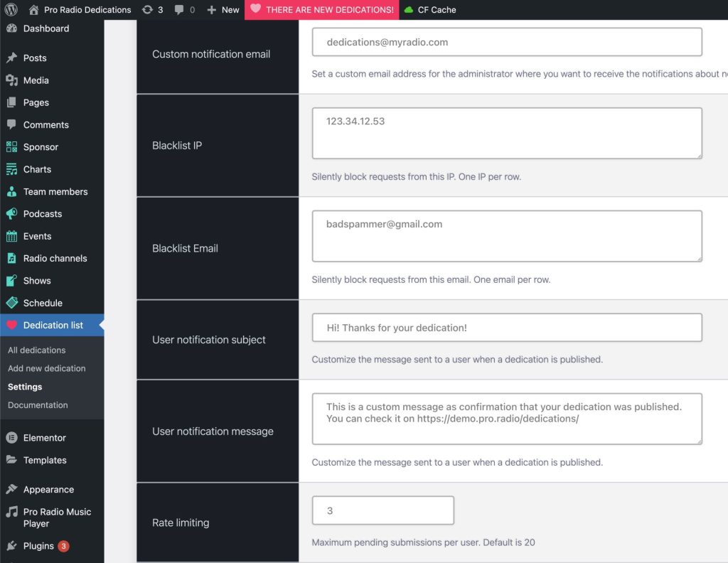Pro Radio Dedications is a WordPress plugin that allows you to collect and display dedications on your radio station website based on the Pro Radio WordPress Theme. This plugin includes a customizable form that can be added to any page using Elementor.