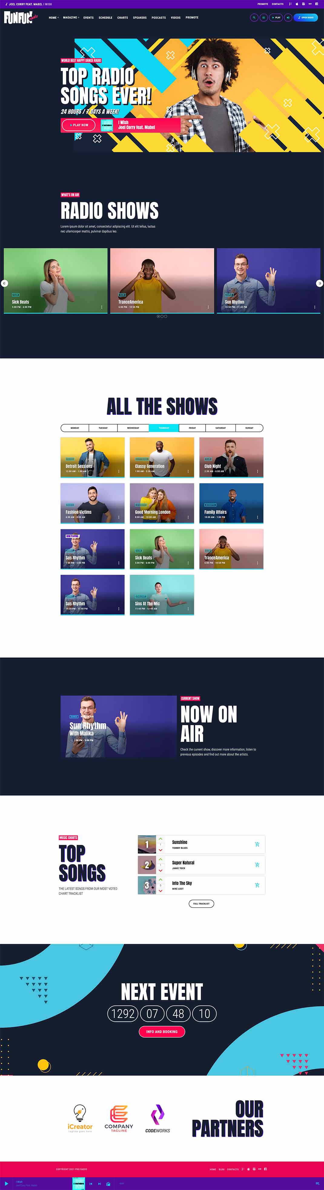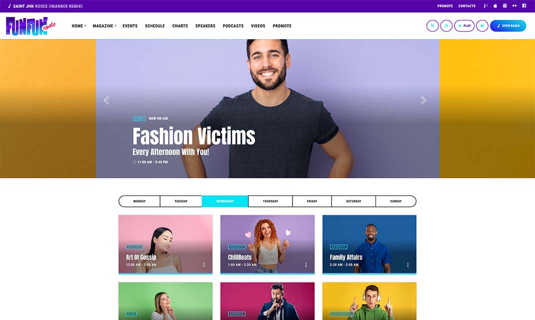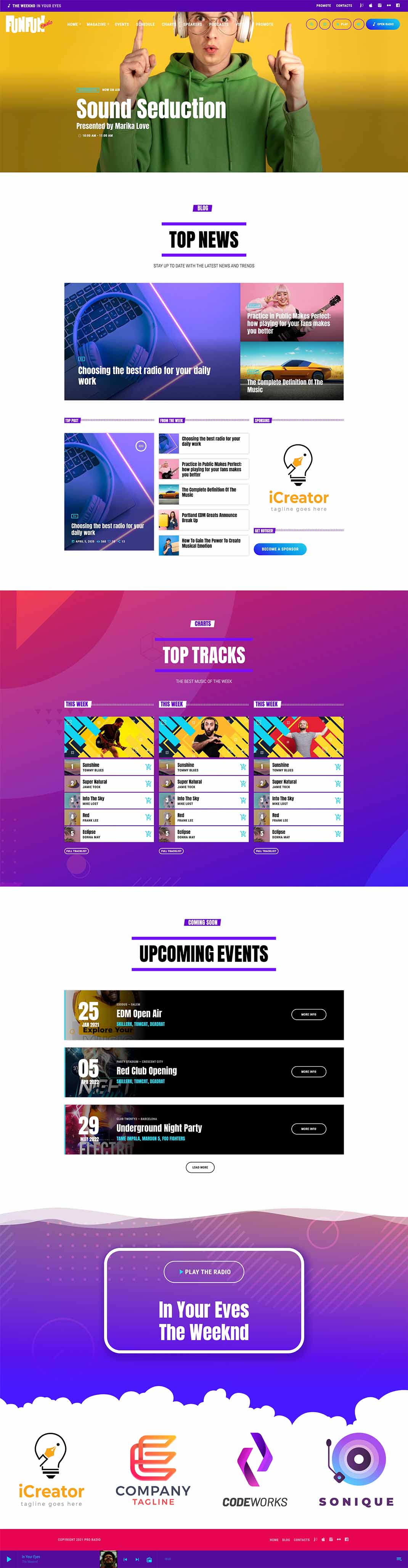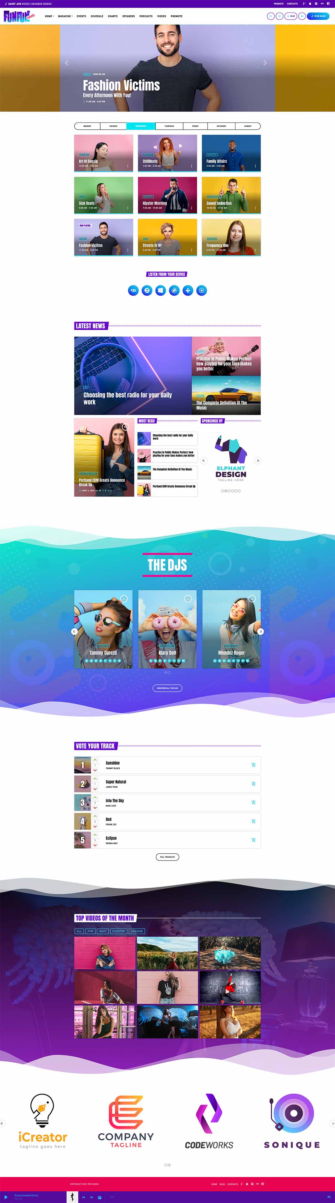 The homepage template 5 has a different look and feel and is a more sober example of pop radio station homepage.It has a colorful player in the header, the upcoming shows carousel, a weekly schedule and then a current show section, followed by the chart tracklist and an upcoming event countdown.