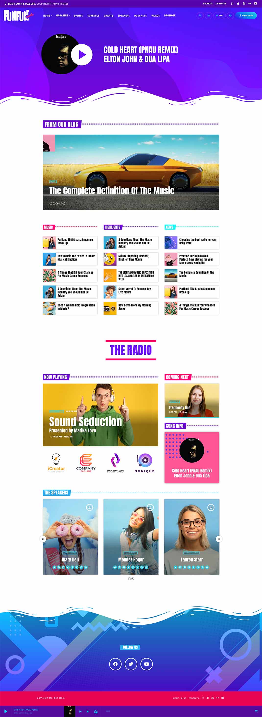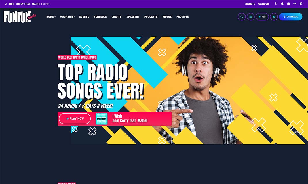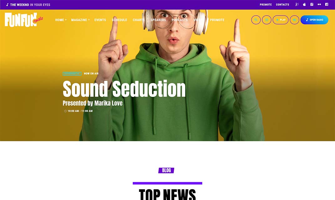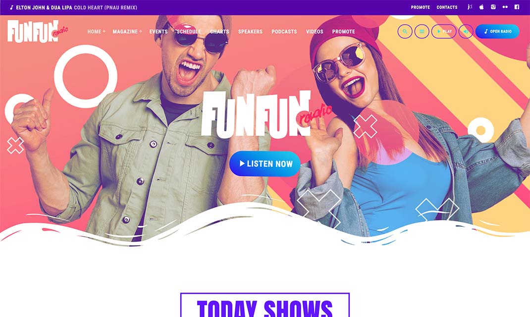 The homepage template 5 has a different look and feel and is a more sober example of pop radio station homepage.It has a colorful player in the header, the upcoming shows carousel, a weekly schedule and then a current show section, followed by the chart tracklist and an upcoming event countdown.