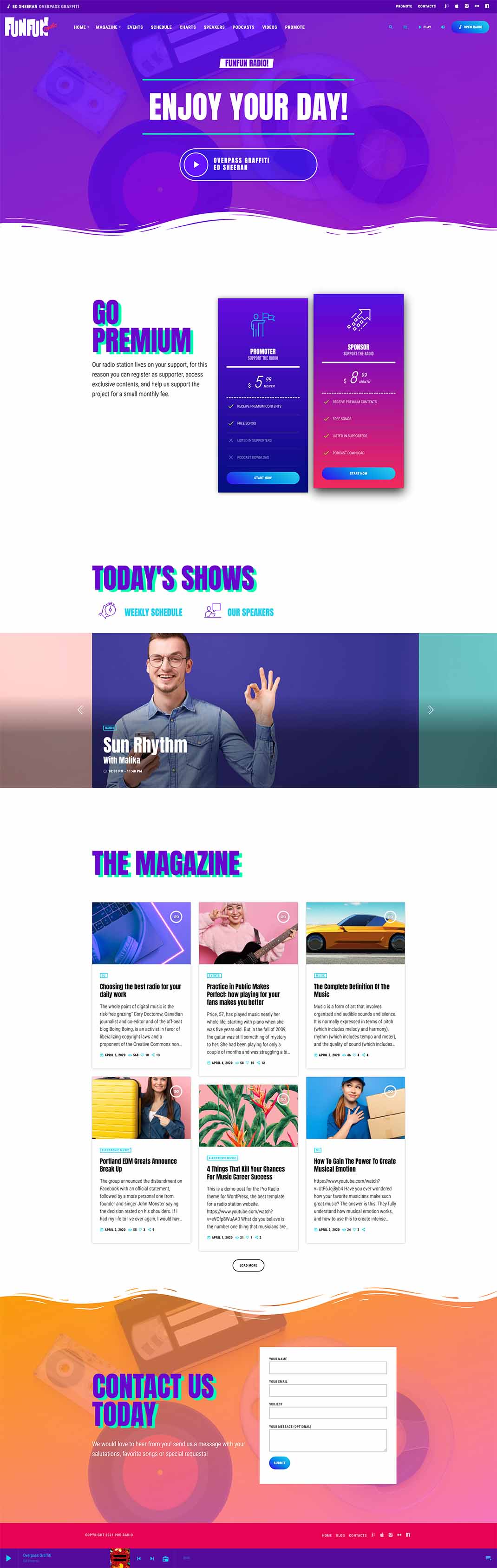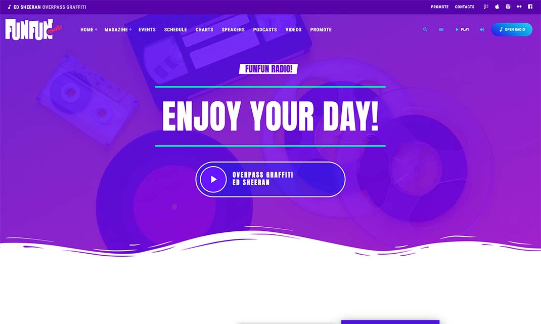 The Pro Radio Demo 02 was built to match a joyful and colorful radio station style, perfect for pop, rock, and other fresh music styles. It comes with 6 radio station homepage templates, that can be edited and combined using Elementor.