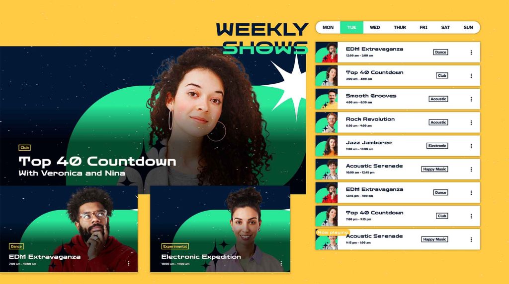 - Program Schedules: Easy-to-manage schedule grids display your full program lineup, including daily shows, special segments, and community events.