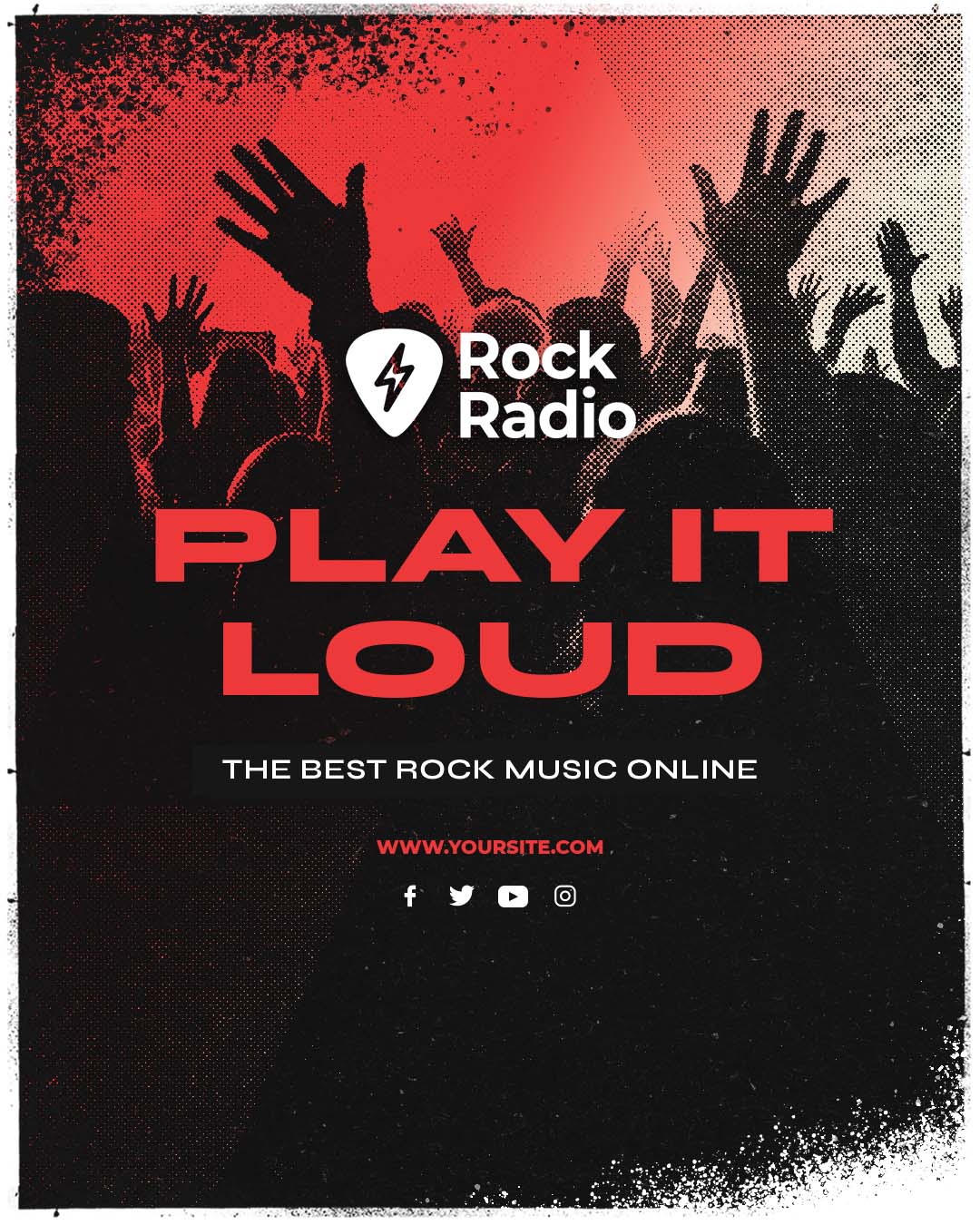 Facebook headers and posts, twitter posts, Instagram templates and Youtube covers are included for your rock radio station!!!