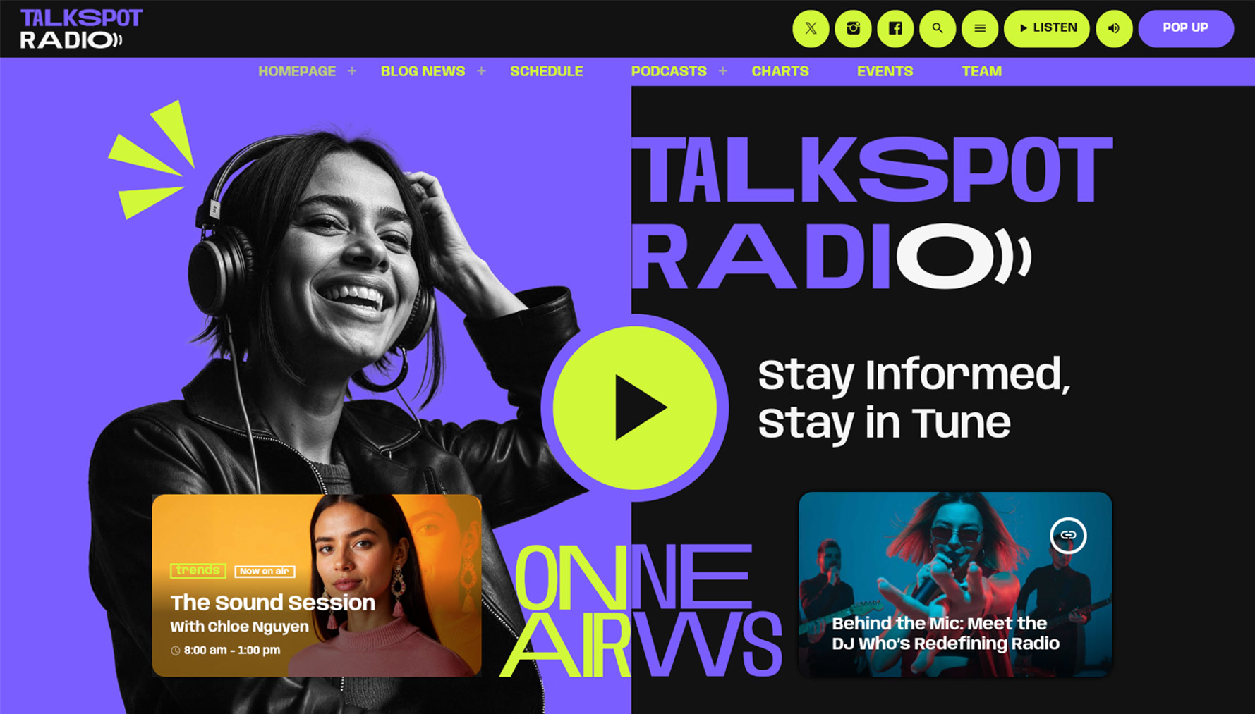 Envision a radio station website that radiates vibrancy—TalkSpot is bold and dynamic. Featuring striking bold color accents, modern typography, and immersive visuals, this template is built to captivate audiences from the moment they land on your site. Designed to reflect the rhythm of contemporary music and broadcasting, TalkSpot seamlessly combines high-energy aesthetics with professional layouts and interactive features, ensuring an engaging experience for every listener.