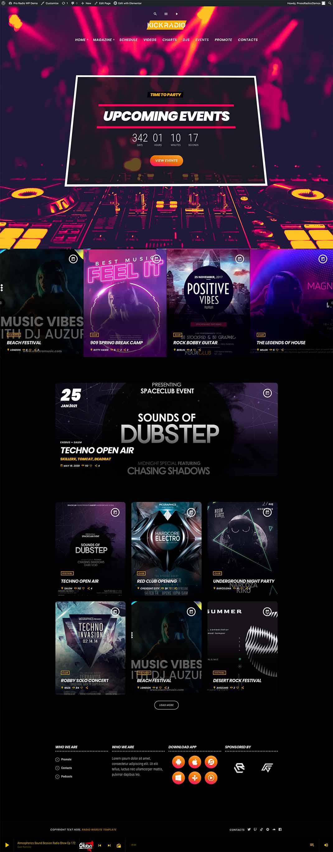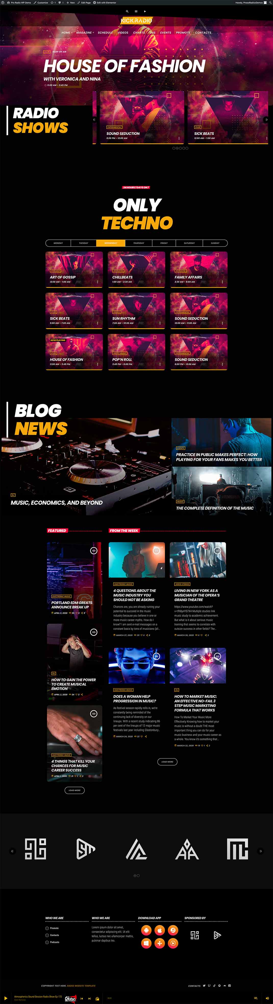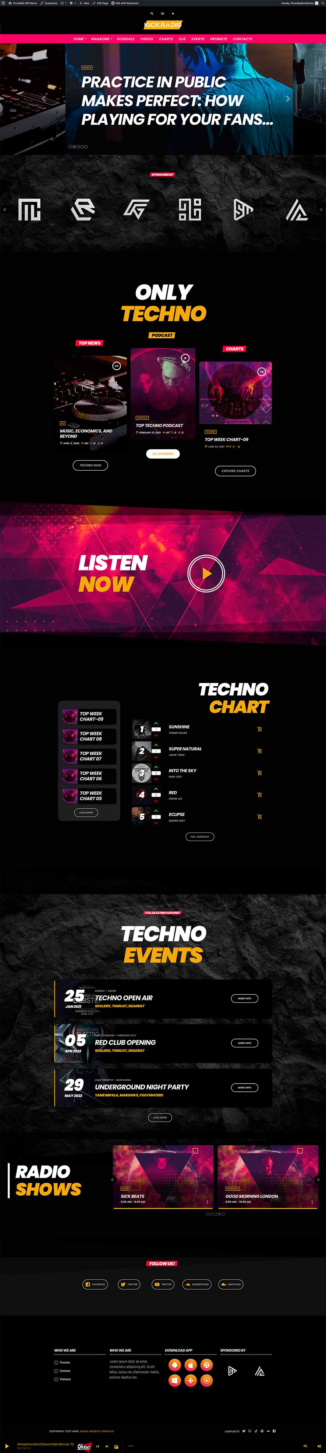 The new techno radio demo features many custom Elementor page templates with lots of radio station Elementotr widgets, like radio shows, schedule, charts, podcasts and events archives, you can check this link.