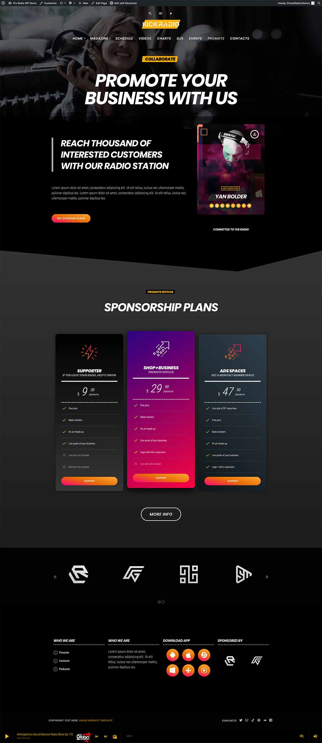 With Pro Radio WordPress theme is possible to install with a couple of clicks this new demo template that has a perfect structure for a techno radio station, including schedule, events, podcasts archive and more.