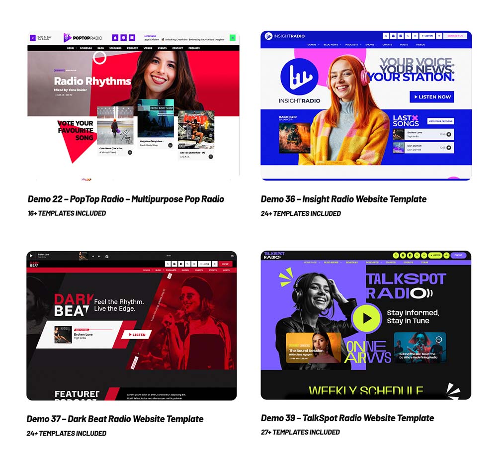 - Insight Radio Website Template: Clean, professional, and content-focused design ideal for news shows, interviews, and long-form podcasts with powerful storytelling features. View Demo