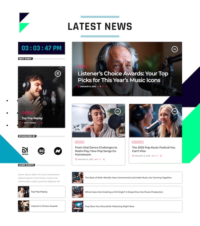 - Latest news section with integrated clock and sponsorships. Display your articles easily in any style or shape with our extended posts widgets gallery