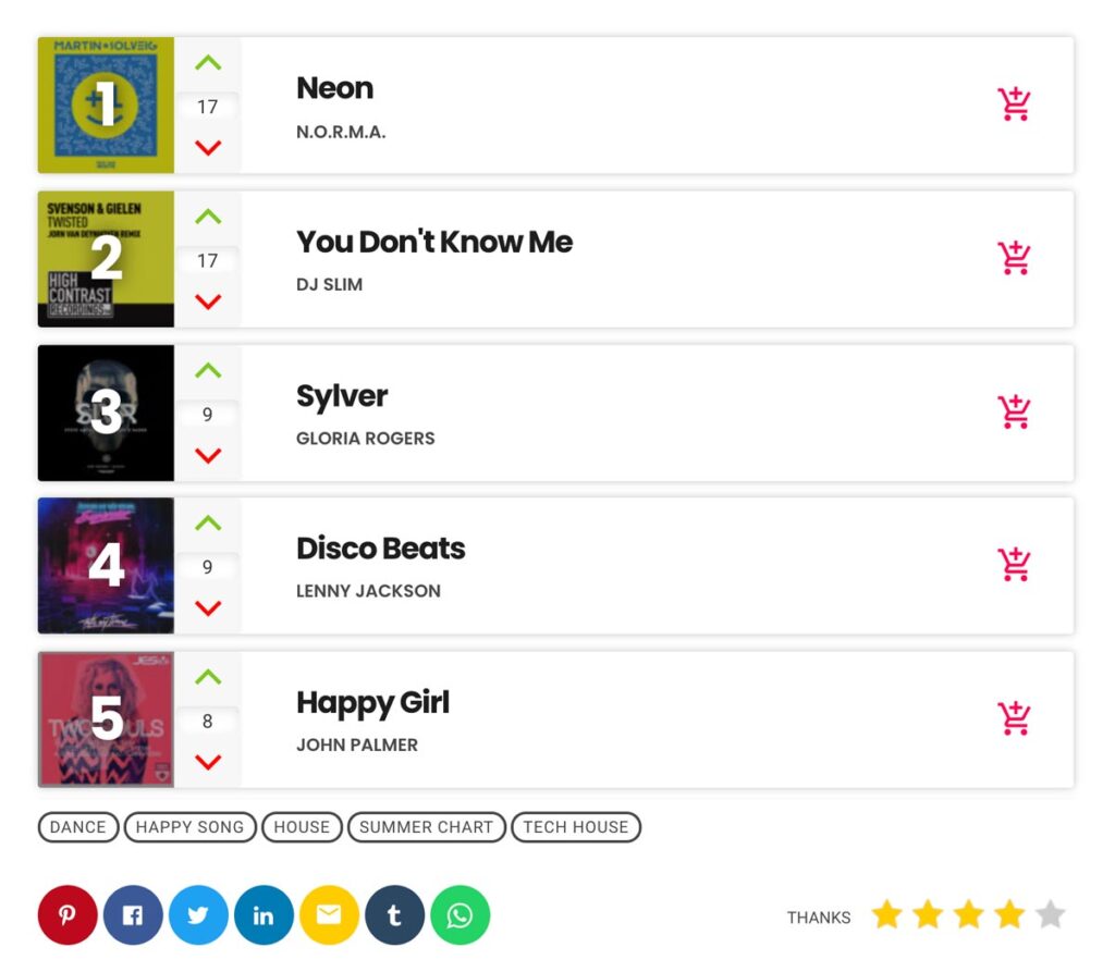 Our charts integration also comes with a voting functionality, that can optionally allow your visitors to upvote or downvote a track.