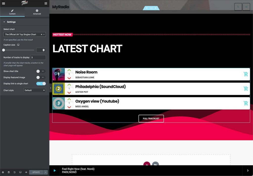 Once a chart is created, you can easily display the tracklist on any page using Elementor. in Elementor, in fact, you have 3 types of chart widgets at your disposal: