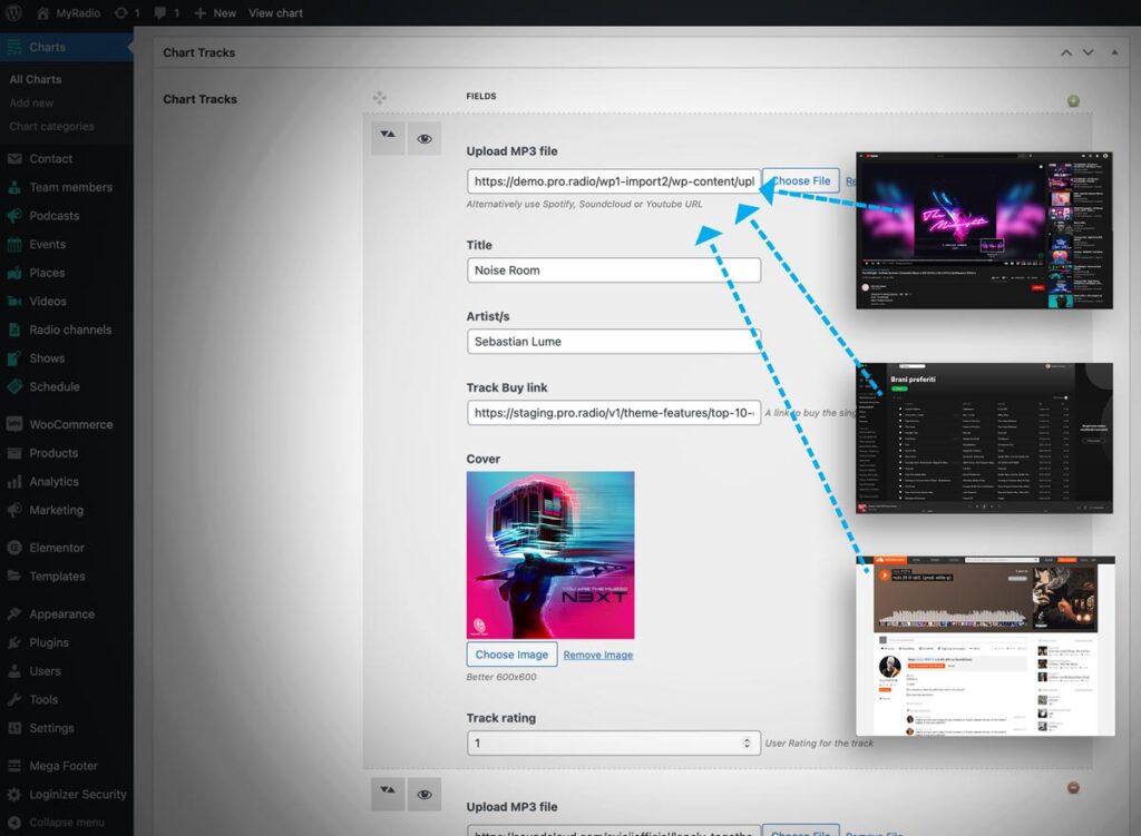 The recommended source type is MP3, as this allows to play the song within the same radio player, pausing the radio stream, but you can also use a secondary source: a YouTube video, a Spotify or a SoundCloud link. if adding an external link, the player will be automatically embedded in the chart tracklist. External players are slower and heavier for the users, so is not the recommended option, but for some songs with a nice video you may want to go for this option.