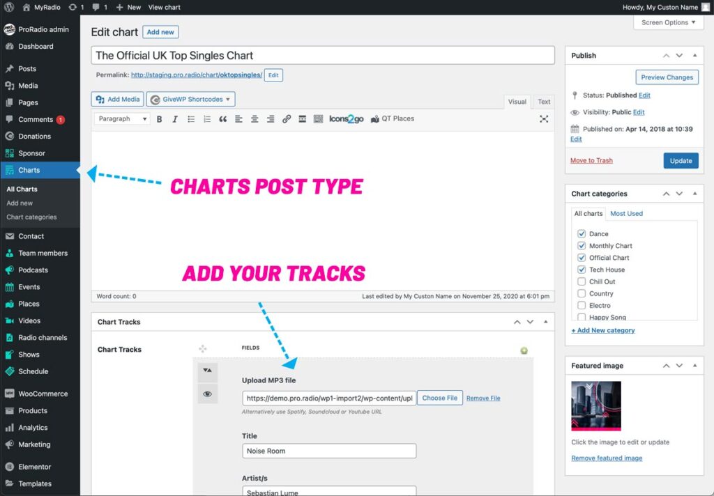 Creating a music chart is easy. pro Radio comes with a custom post type, and each Chart post can contain its own custom contents and unlimited songs.