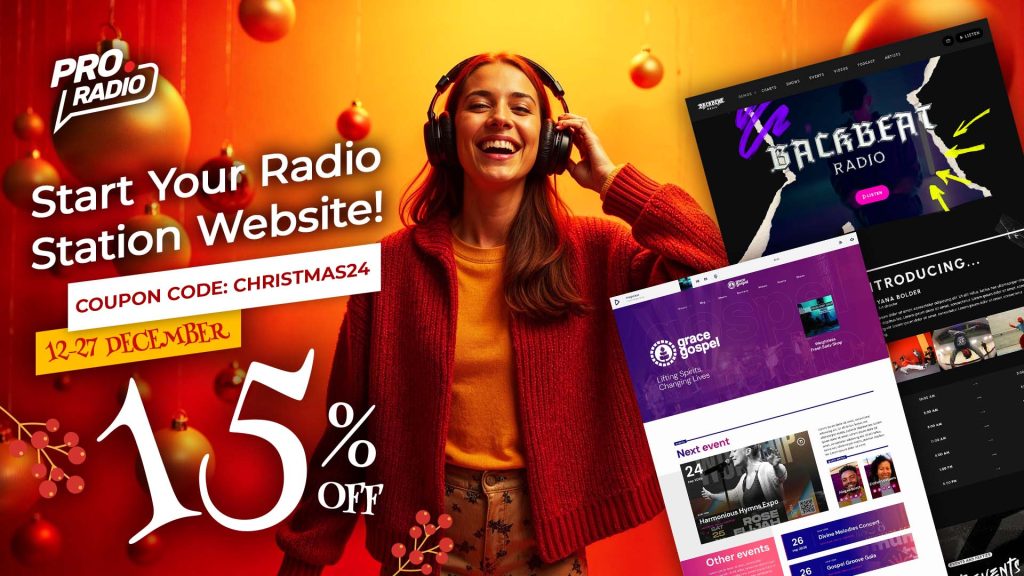 This festive season, spread holiday cheer with a professional and stunning website for your radio station! From December 12th to December 27th, enjoy an exclusive 15% discount on the Pro Radio WordPress Theme, the ultimate solution for modern broadcasters. Plus, this special offer is also available for the All-In-One WordPress Theme, making it the perfect