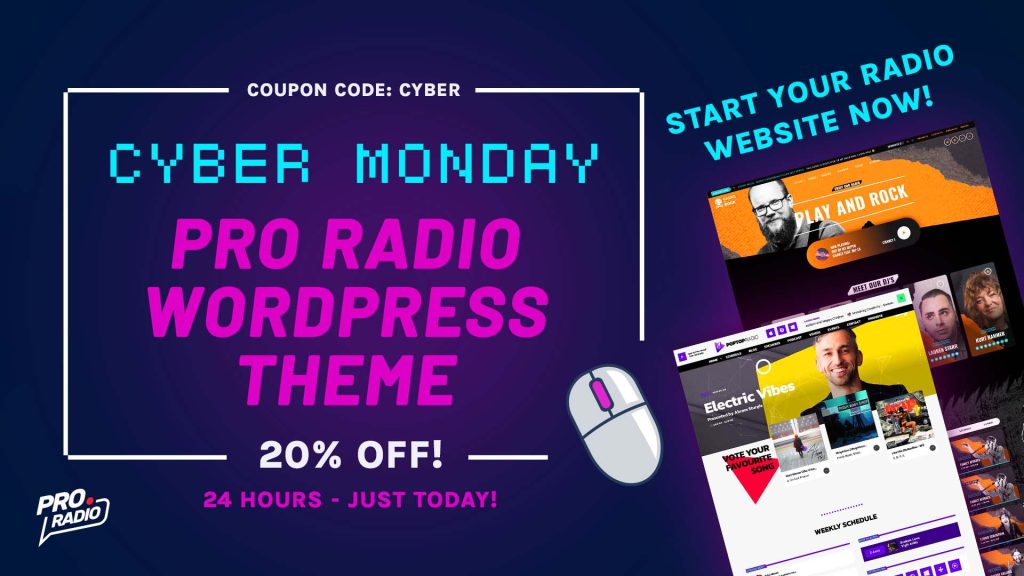 Today only, take advantage of our Cyber Monday Special and save 20% on the Pro Radio WordPress Theme! Create a stunning and professional website for your radio station with the leading WordPress theme for broadcasters. This exclusive deal is available for one day only – don’t miss your chance to join thousands of radio professionals who trust Pro Radio to power