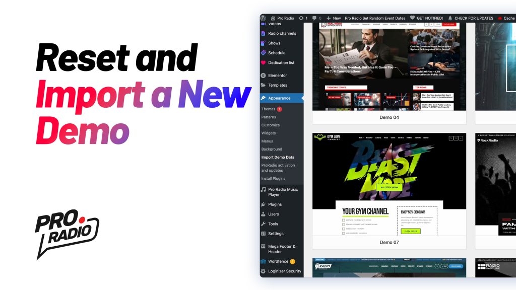 https://www.youtube.com/watch?v=4L55Y7pANzQ     In this tutorial, we’ll guide you through resetting your WordPress website and installing a new demo for Pro Radio. Attention! The following procedure will entirely reset your website: any post and page will be permanently deleted. Follow these steps carefully: Install WP Reset Plugin Go to Plugins > Add New, search for