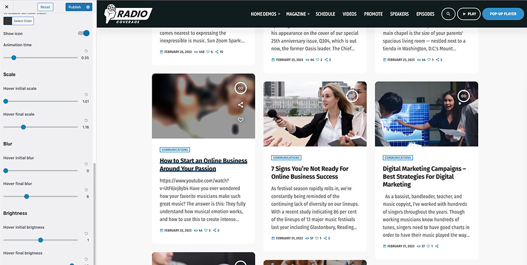 - Archive items have now 20 new options to customize the initial and hover state design, for instance greyscale, blur, zoom and more