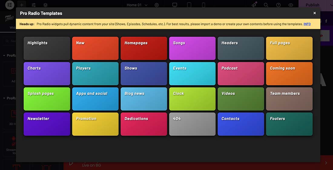 A lot of customers ask us daily how to install a new demo. This process used to be very time-consuming, as it required almost rebuilding the site from scratch. That’s why we created the new Pro Radio Elementor Template Library—to provide an easy way to refresh a radio website without rebuilding.