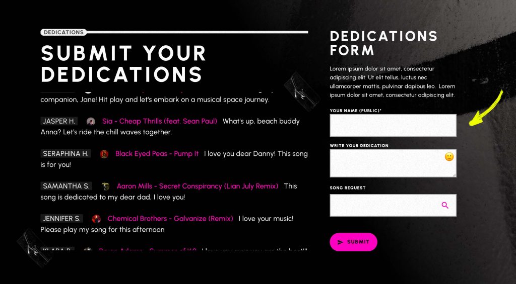 - Pro Radio Dedications Plugin: Make your listeners feel like part of the show with the Pro Radio Dedications Plugin. Allow them to submit messages, song requests, and shout-outs directly through your website. Integrate these dedications seamlessly into your broadcasts, creating a personalized experience and letting your listeners know they’re heard. The plugin comes for free within the Pro Radio WordPress Theme and has an optional upgrade for more advanced features.