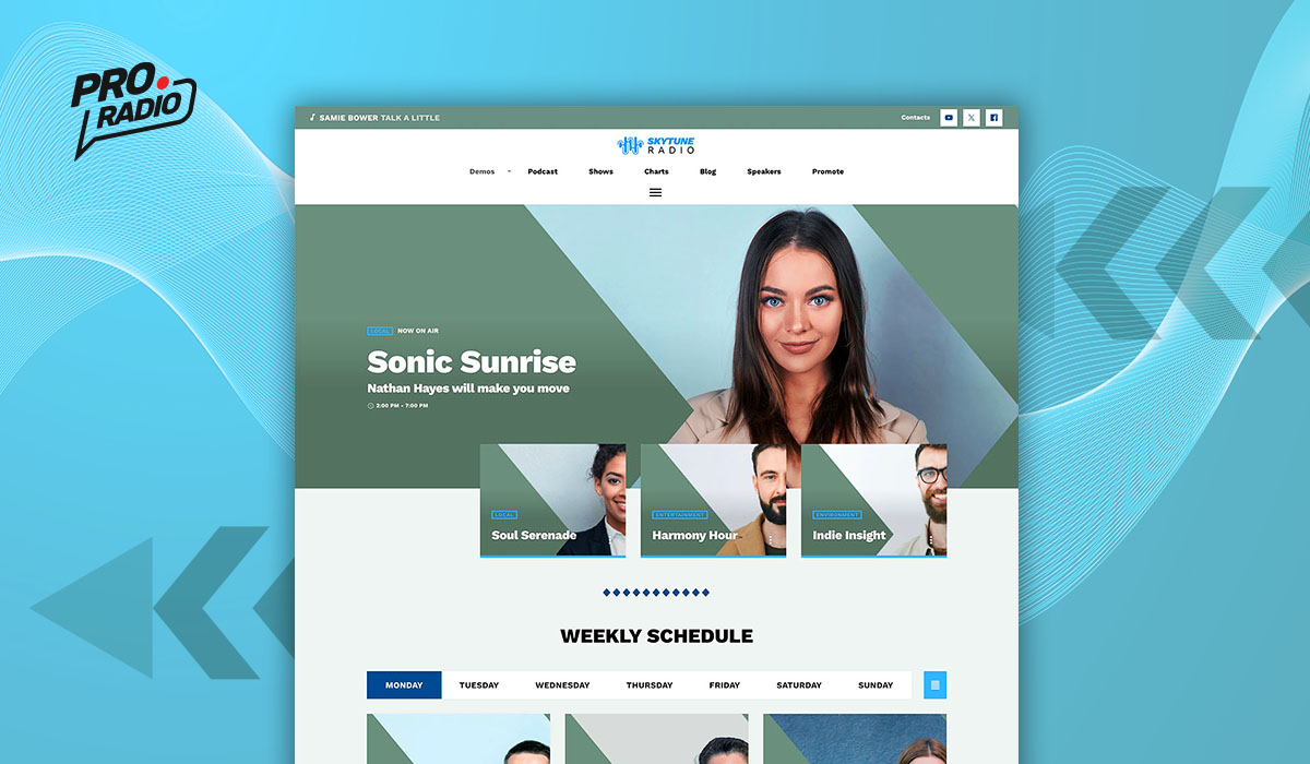 At the start of this first SkyTune Radio homepage, we see a shows slider next to a shows carousel, followed by a weekly schedule. Then we find a song rank built with the new Pro Radio Sidekick feature that allows you to vote, buy or listen to the songs displayed, a featured chart section with a dedication list, a featured host section, a podcast selection carousel, followed by a section with the radio’s most listened to podcast episodes, a featured next event section and a video interview with some text and photo highlights of the interview.