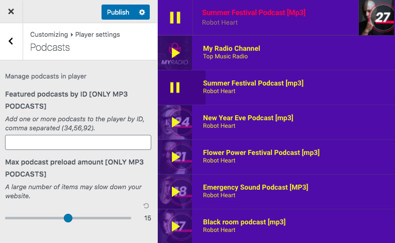 You can add unlimited songs straight from the customizer, or preload podcasts from the custom Podcasts post type. The listening experience on pro Radio is far superior to any other previous theme like onAir2 because the same player can be used to manage and play any audio source on the website.