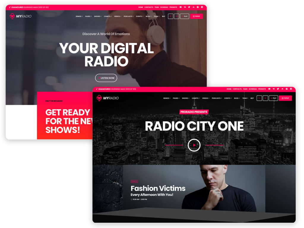 The main function of a radio station website is to play the music. For this reason, the player functionality is the most important key point for any radio station web page. This is why the Pro Radio WordPress Theme comes with the most relevant features to make sure your visitors can listen to the music, enjoy the audio on any page, and enjoy the contents and pages of your website without stopping the audio. The player of the Pro Radio WordPress theme, in fact, has the top features required for a radio station which are:
