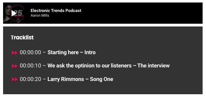 In the frontend result of your podcast page, the timestamp will appear as a playlist, with clickable icons, allowing a listener to skip to a specific mark of the recording, for the optimal accessibility of the media.